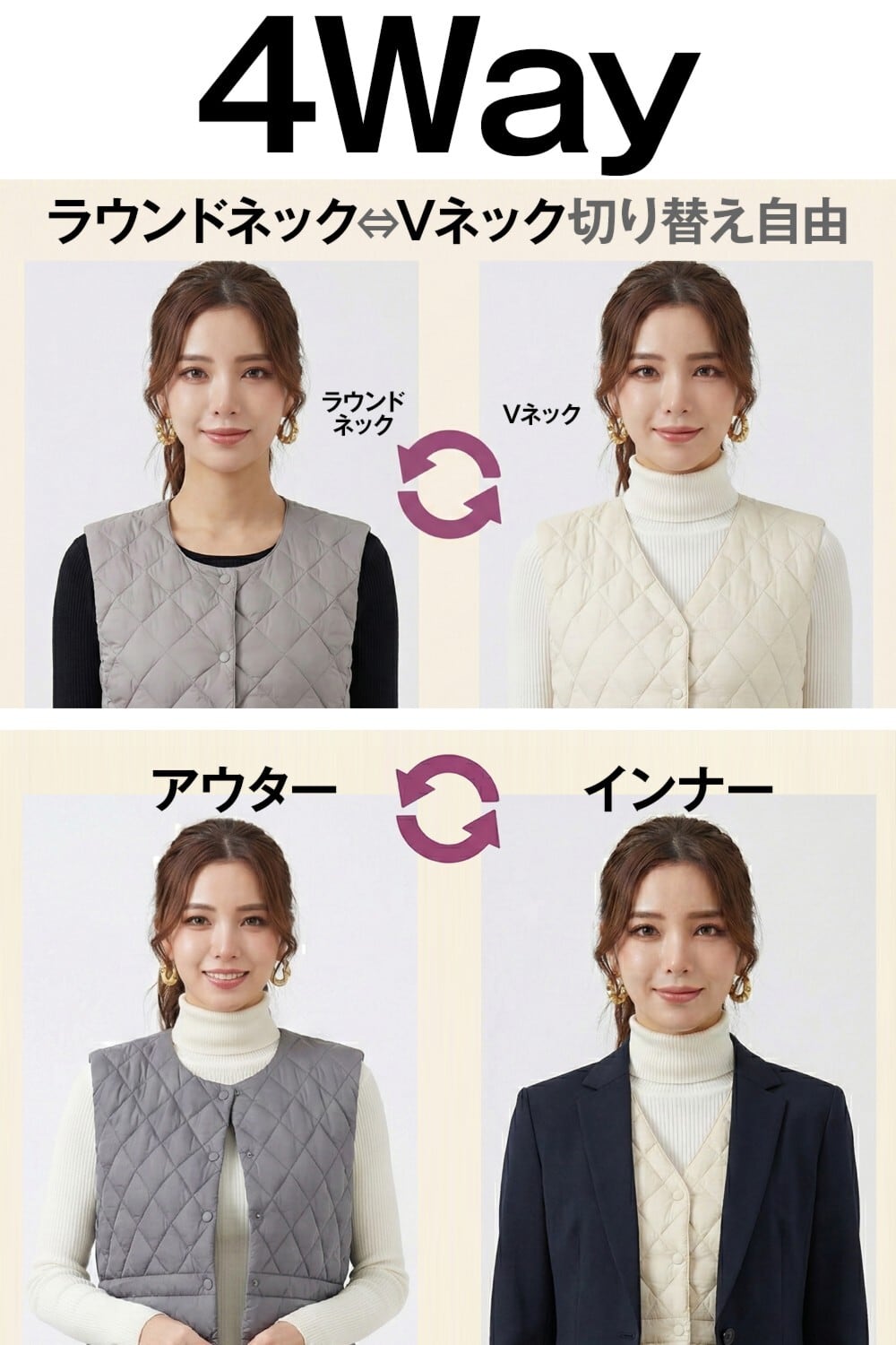 通勤・オフィス:ジャケットやコートの中に着られるインナーベストとして。
